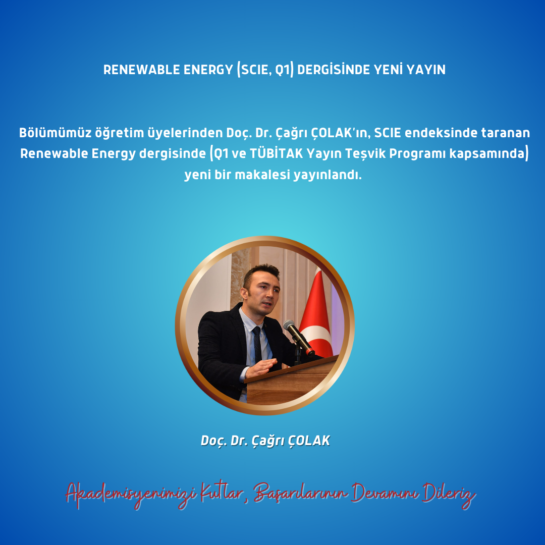 Bölümümüz öğretim üyelerinden Doç. Dr. Çağrı ÇOLAK’ın, SCIE endeksinde taranan Renewable Energy dergisinde (Q1 ve TÜBİTAK Yayın Teşvik Programı kapsamında) yeni bir makalesi yayınlandı.